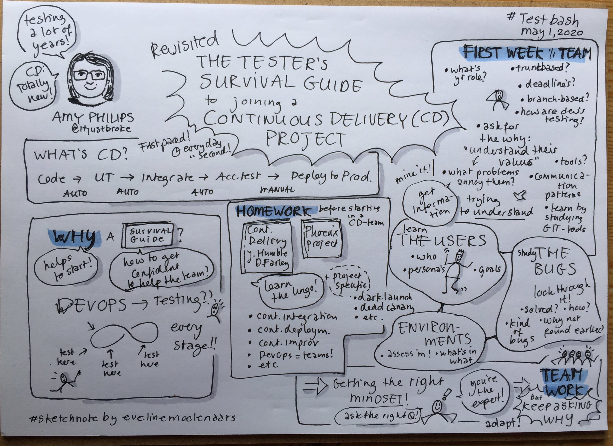 #sketchnote from Amy Phillips’ talk on The Tester’s Survivial Guide to Joining a Continuous Delivery Project.
