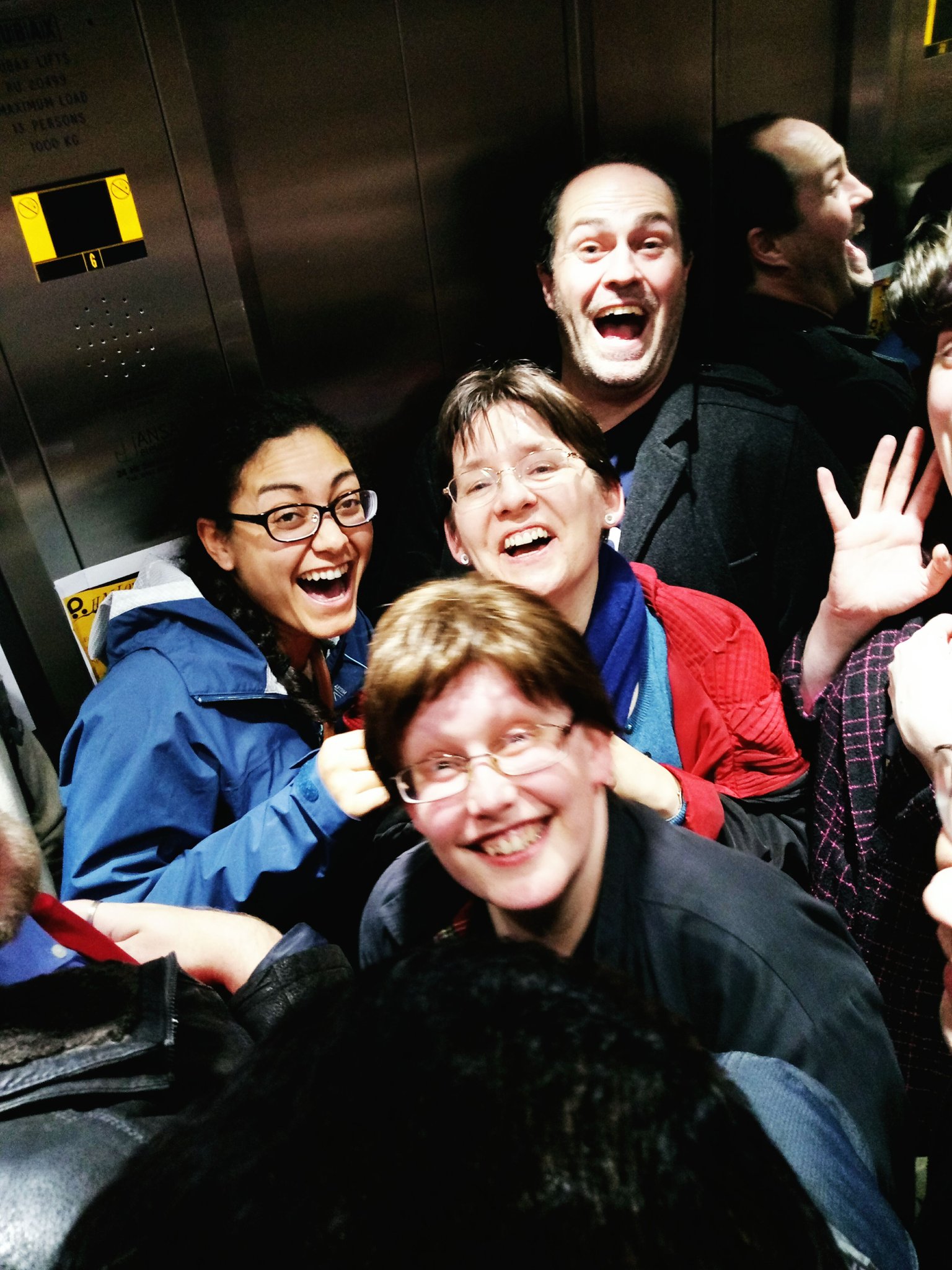 Then we were leaving a meetup, someone pointed to the sign saying how many people the lift could take. As is going to happen with a group of testers, we tested the theory. You can see the results in the picture. This lift seemed to function perfectly fine with the load we tested. It announced the correct floors, we were delivered safely to the exit.