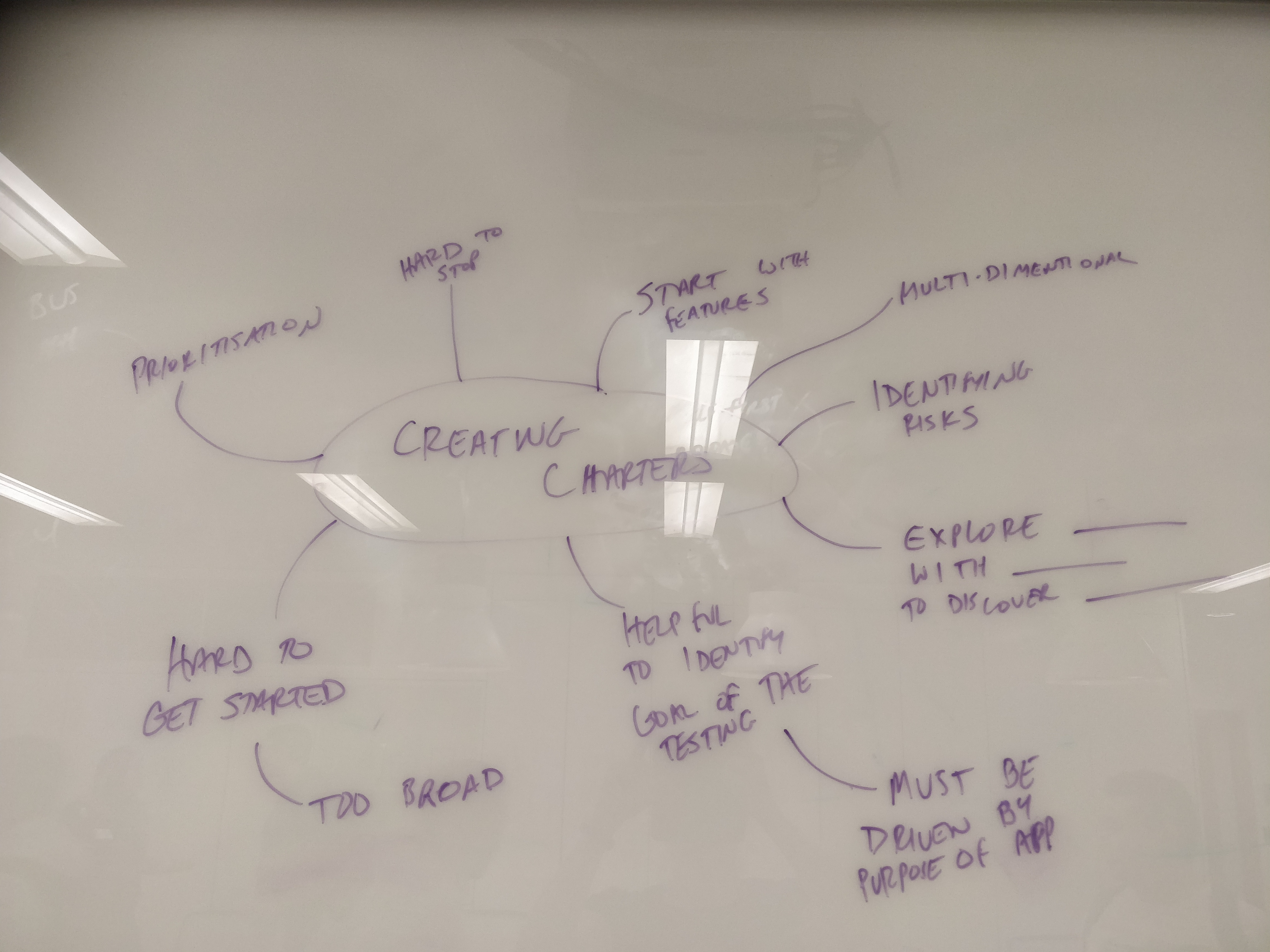 One of the biggest reasons this testing experience felt very ad hoc was because of the very broad ask. So we then discussed how chunking the features, behaviours, characteristics (shout out to the SWTC London - Identifying risk session!) to more reasonable sized test ideas could support better focus. This was the driver to then start identifying what those Charters (or chunks of risk to investigate) might be for the app. Again in small groups people generated extensive lists so much so that many blew right though our 10 minute break. As a group we then heard about the kickstart some groups needed to get away from commonly spoken about feature breakdowns and into more creative and valuable chunks.