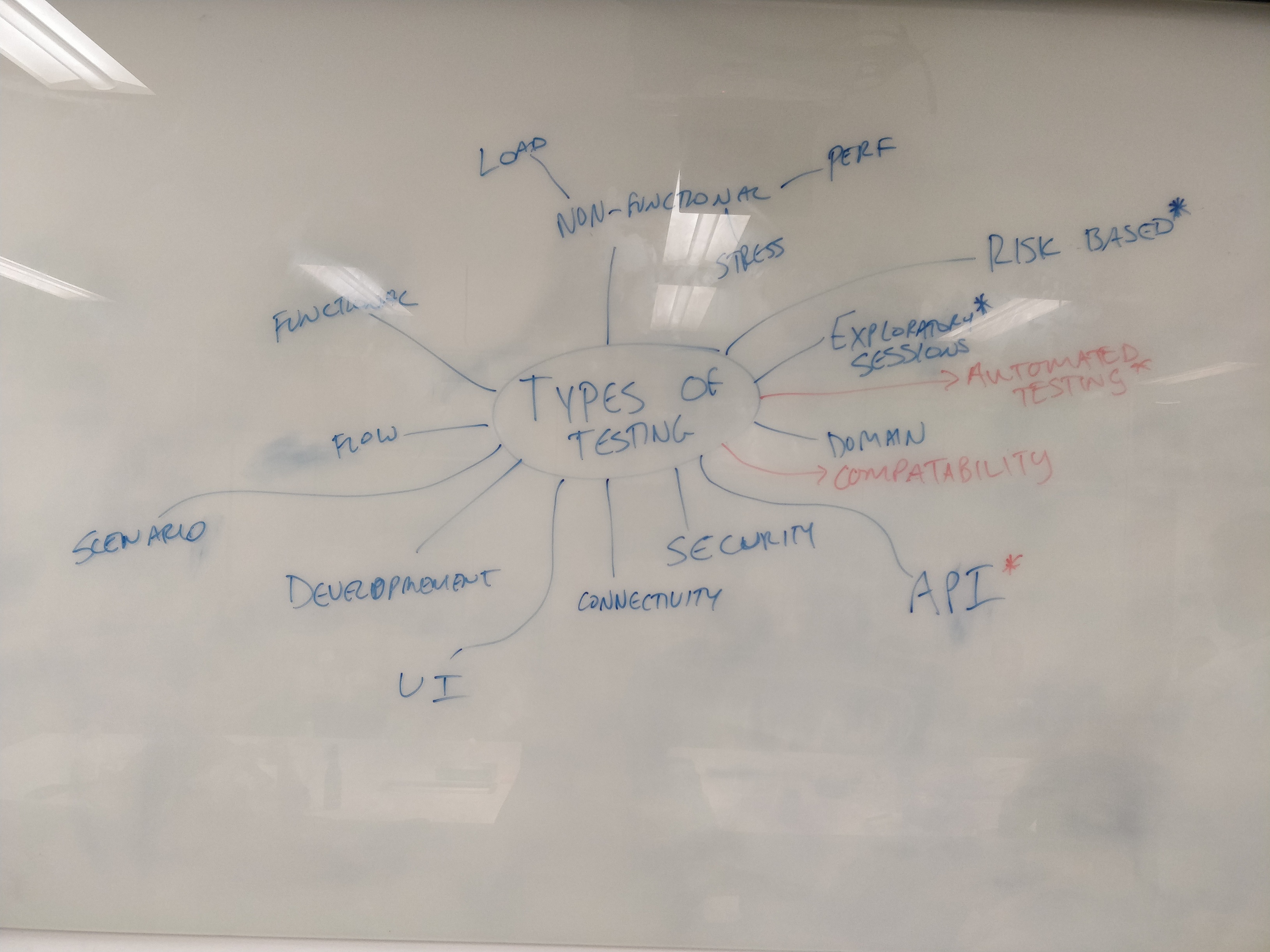 We kicked off with a great chat about what types of testing really means. There was a bit of debate though…what do you think, the ones with asterisks, are they types of testing or something bigger than that?